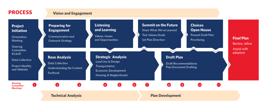 The process will last just over one year, with the initial Steering Committee meeting being held in late February 2018. The team will meet regularly throughout the process to plan outreach activities, discuss technical analysis, and set the general direction for the Plan. Residents and business owners can contribute their thoughts and ideas at the in-person workshops, at a small meeting-in-a-box, or through the website. Ideas shared could serve as the foundation for the community’s vision statement, contribute to one of the Plan’s goals, inspire a specific action (like a new project, policy, or program), or set the course for implementation. Finally, recommendations will emerge in each topic that melds the technical analysis with the intuition of the people.